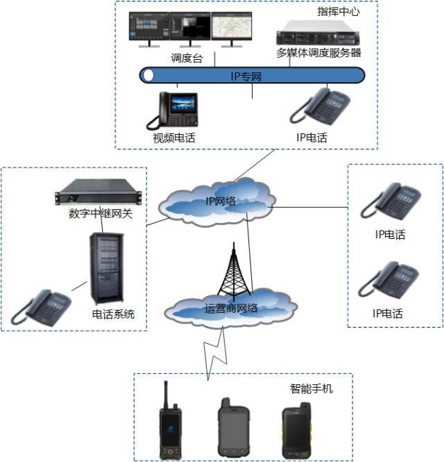 業務融合,通過不同功能的網關,可以與行業中常用的業務系統對接,如與PDT/DMR/LTE專網系統、監控系統、電話系統、廣播系統,將不同系統納入統一平臺,實現公網專網統一調度、相互備份、高效可靠,成為專網的有力支撐和補充