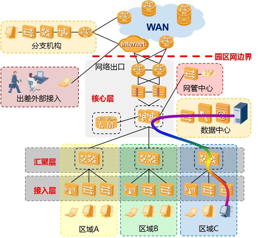 一般而言,園區網絡分為接入層,匯聚層,核心層及網絡出口。接入層提供以太網以及WLAN網絡接入,以及終端的準入控制。匯聚層收集各個區域流量,上行至核心交換機。核心層實現各個區域、園區出口和數據中心之間的高速轉發。網絡出口連接園區網絡和Internet,或連接到企業自建的廣域網絡,外部分支機構和出差人員可以使用VPN等方式接入園區網絡。如何對園區網絡進行端到端的IPv6演進,我們嘗試做出階段性的解析。