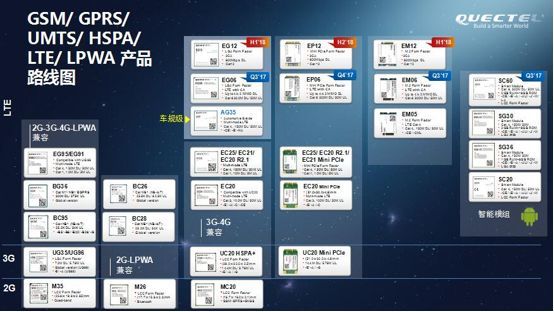 其中,包括四款LTE-A系列產品Cat 6 EG06、EM06、EP06 和Cat 12 EM12模組;一款LTE Cat 6 SC60安卓智能模組;一款專門為有 IATF 16949:2016 標準需求的汽車領域應用而設計的AG35車規級模組;以及三款全頻段NB-IoT模組。