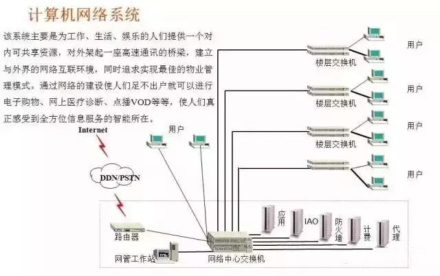 該系統主要是為工作、生活、娛樂的人們提供一個對內可共享資源,對外架起一座高速通訊的橋梁,建立與外界的網絡互聯環境,同時追求實現最佳的物業管理模式。通過網絡的建設使人們足不出戶就可以進行電子購物、網上醫療診斷、點播VOD等等,使人們真正感受到全方位信息服務的智能所在。