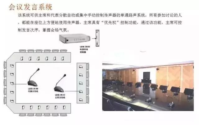 該系統可供主席和代表分散自動或集中手動控制傳聲器的單通路聲系統,所有參加討論的人,都能在座位上方便地使用傳聲器,主席具有“優先權”控制功能,通過該功能,主席可控制發言次序,掌握會場氣氛。