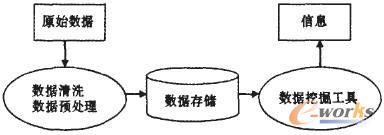 與傳統的統計分析相比。數據挖掘的確不用專門進行實驗設計和調查設計。不用為確定的目的準備大量的數據,因為在進行數據挖掘之前已有數據庫,其目的也是不確定的。作為一種先進的數據信息處理技術,數據挖掘與傳統的數據分析的本質區別在于它是數據關系的一個探索過程.而且多數情況下是在沒有任何假設和前提的條件下完成的。就現實來看。經過幾年的信息化建設,許多大中型企業已經建立了比較完善的客戶關系管理(CRM)、ERP、OA等基礎信息化系統,這種大集中系統已為數據挖掘準備了較為成熟的條件。但直接從數據庫中截取的數據往往是冗余的、缺失的、有噪聲的,從而直接影響數據挖掘的效果。輸入數據庫中的異常數據、不相關的字段或互相沖突的字段、數據的編碼方式等,都會對數據挖掘輸出結果的質量產生影響。數據挖掘最后成功與失敗,是否有經濟效益。數據準備起到了至關重要的作用。從原始數據轉化為挖掘信息的流程如圖1所示。