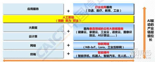 人工智能產業鏈結構分為基礎層(計算基礎設施)、技術層(軟件算法及平臺)與應用層(行業應用及產品)。