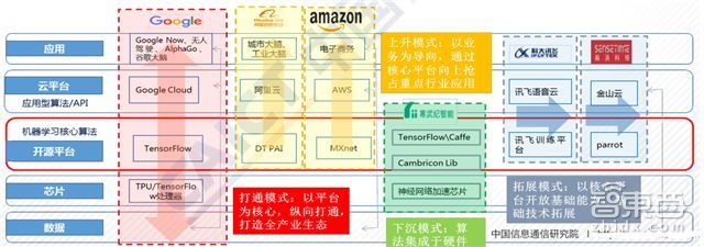 基礎開源框架方面,優勢企業如谷歌、亞馬遜、臉書加快部署機器學習、深度學習底層平臺,建立產業事實標準。目前業內已有近40個各類AI學習框架,生態競爭異常激烈。