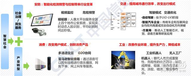 對于安防產業,AI指向了智能化檢測預警與控制,將帶來行業變革;對于交通,駕駛模式、交通優化等AI方案將提高城市通行效率,改變人們的出行模式;對于消費市場,智能音箱、智能家居等多通道交互產品將改變用戶模式,催生新的O2O平臺;對于工業而言,AI指向的工業機器人,甚至無人工廠將改善作業環境,提升生產力,降低成本。