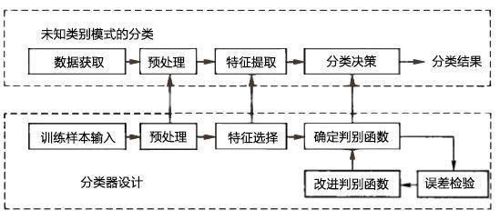 一個(gè)典型的模式識(shí)別系統(tǒng)如圖所示,由數(shù)據(jù)獲取、預(yù)處理、特征提取、分類決策及分類器設(shè)計(jì)五部分組成。一般分為上下兩部分:上部分完成未知類別模式的分類;下半部分屬于分類器設(shè)計(jì)的訓(xùn)練過程,利用樣品進(jìn)行訓(xùn)練,確定分類器的具體參數(shù),完成分類器的設(shè)計(jì)。而分類決策在識(shí)別過程起作用,對(duì)待識(shí)別的樣品進(jìn)行分類決策。