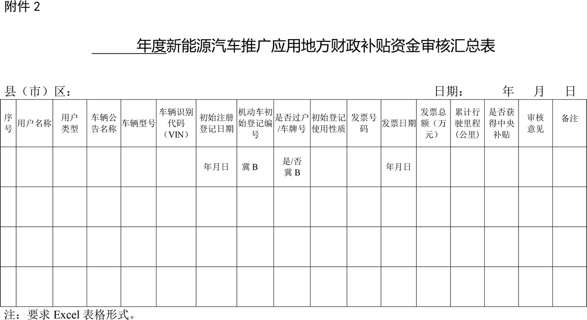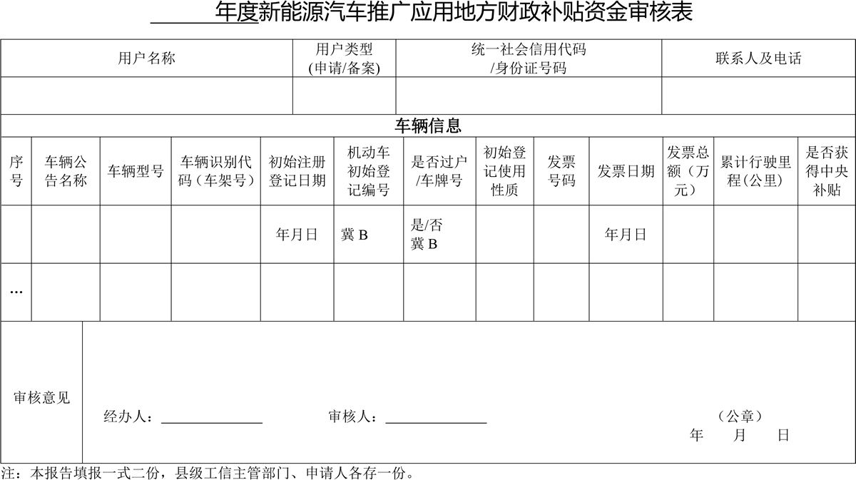 附件: 唐山市2016年和2017年新能源汽車推廣應用地方財政補貼辦法 為加快我市新能源汽車的發展和推廣應用,減少污染物排放,根據河北省財政廳、河北省工業和信息化廳《河北省新能源汽車推廣應用補貼資金管理辦法》(冀財建〔2016〕165號)、河北省財政廳等四部門《轉發四部委調整新能源汽車推廣應用財政補貼政策的通知》(冀財建〔2017〕48號)和唐山市人民政府《關于加快新能源汽車產業發展和推廣應用的實施意見》(唐政字〔2016〕98號),結合我市實際,制定唐山市2016年和2017年新能源汽車推廣應用地方財政補貼辦法。 一、補貼范圍 購買符合補貼資金要求的新能源汽車,于2016年1月1日至2017年12月31日,在唐山市公安車管部門完成初始注冊登記、實際運行使用的本市購車用戶。符合補貼資金要求的新能源汽車,是指在2016年1月1日至2016年12月31日完成初始登記的必須是已納入《新能源汽車推廣應用推薦車型目錄》(2016年第1-5批)的車型,在2017年1月1日至2017年12月31日完成初始登記的必須是已納入《新能源汽車推廣應用推薦車型目錄》(2017年第1-12批)的車型;非個人用戶購買的新能源汽車累計行駛里程須達到3萬公里(作業類專用車除外)。 二、補貼標準 公交車按照中央財政補貼標準的50%給予補貼。公交車以外的其他車輛,新能源乘用車按照每輛車最高不超過1萬元、新能源客車按照每輛車最高不超過4.5萬元、新能源專用車按照每輛車最高不超過3萬元標準,給予補貼。補貼上限同時不得超過中央財政單車補貼額的50%。 三、申報審核 自本通知印發之日起,補貼范圍內的用戶按照屬地原則申報,申報時應提交如下材料: (一)真實性聲明; (二)車輛生產企業提供的獲得中央財政補貼資金聲明原件(若暫不能提供可后補充,但應在規定申報時限內完成備案); (三)新能源汽車推廣應用地方財政補貼資金審核表; (四)單位提供營業執照、經辦人身份證復印件,個人提供身份證復印件(此項均需交驗原件); (五)車輛合格證、一致性證書復印件,車輛銷售發票、注冊登記證、行駛證復印件(此項均需交驗原件); (六)截至申請(備案)日期的里程表照片(加日期標記,打印到A4紙上,此項需現場核實); (七)公交車用戶另需提供,由交通運輸管理部門或城管部門,或者縣級政府出具的申報補貼車輛為公交車的書面證明原件,并附線路、站點、時間安排等材料(此項需現場核實)。 各縣(市)區工業和信息化主管部門負責組織、受理本地補貼資金申請工作,對補貼資金申報材料的合法性、合規性和真實性進行審核,應審查用戶提交材料(四)、(五)款的原件,并對(六)、(七)款進行現場核實,留存詳細審查底稿(暫不能提供獲得中央財政補貼資金聲明的按照上述程序予以備案審核),提出補貼資金審核意見,提交本級財政部門。同級財政部門據此提出補貼資金審核意見,聯合工業和信息化主管部門書面上報市財政局、市工業和信息化局。 市財政局、市工業和信息化局對已提供獲得中央財政補貼資金聲明,符合補貼要求的車輛和補貼額度公示無異議后,市財政部門將補貼資金撥付所在地財政部門,由所在地財政部門復核兌現。對未提供獲得中央財政補貼資金聲明的,待補充完善后按上述程序復核兌現。 四、其他事項 申報時間截至2018年5月31日,逾期不再受理。各縣(市)區財政局、工業和信息化主管部門應于2018年7月31日前聯合行文報市財政局、市工業和信息化局。 附件:1.申請報告(格式) 2.審核匯總表(格式)