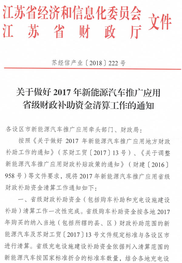 現將省經信委、省財政廳《關于做好2017年新能源汽車推廣應用省級財政補助資金清算工作的通知》(蘇經信產業〔2018〕222號)(以下簡稱“省通知”)轉發給你們,請迅速組織開展。并就我市做好此項工作提出要求如下: