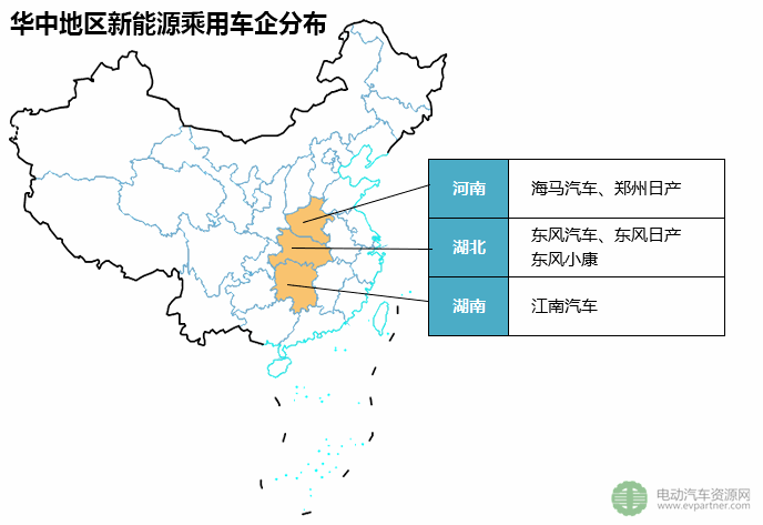 華中地區共有河南、湖南、湖北三省,共計新能源乘用車企業5家。其中,河南有海馬汽車和鄭州日產,湖北有東風汽車、東風日產以及東風小康;而湖南只有一家江南汽車,也就是眾泰汽車。