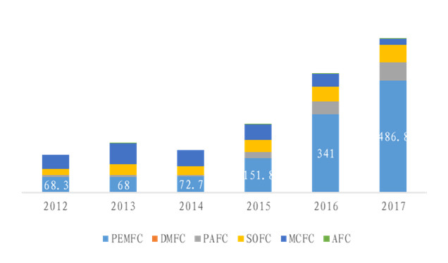 從出貨兆瓦數(shù)來看,PEMFC的單體發(fā)電量從2012年開始出現(xiàn)較為明顯的提升,由12年的1.7KW/套提升至17年的10.7KW/套。