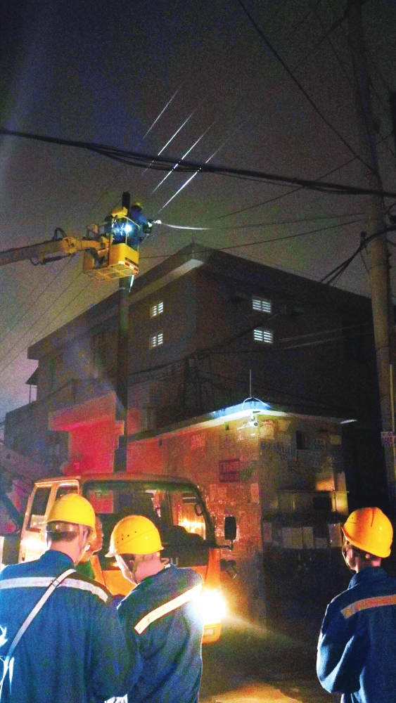6月8日晚,廣州市白云區石井街一專變用戶高壓室被雨水沖壞基礎,為防止高壓室倒塌將其他架空線路拉倒,廣州供電局立刻組織人員連夜搶修。 (劉富強 攝)