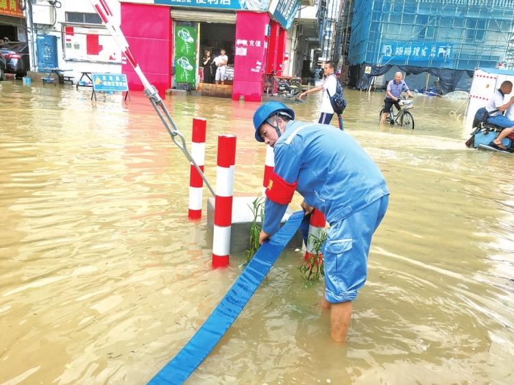 6月8日下午,廣東電網公司黨員突擊隊隊員正在敷設抽水泵管,為被浸的公用配電站電房排水。 (郭偉 攝)