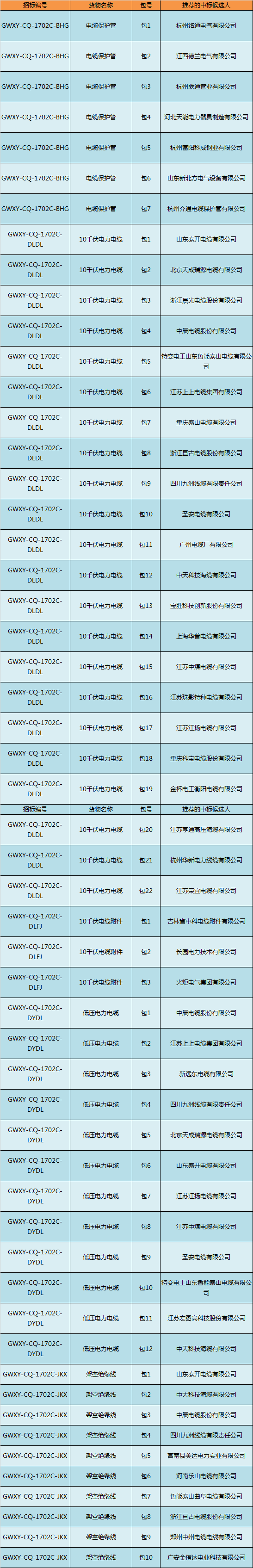 國網(wǎng)重慶2017年第二次配網(wǎng)設(shè)備/線材協(xié)議庫存貨物招標(biāo)中標(biāo)候選人