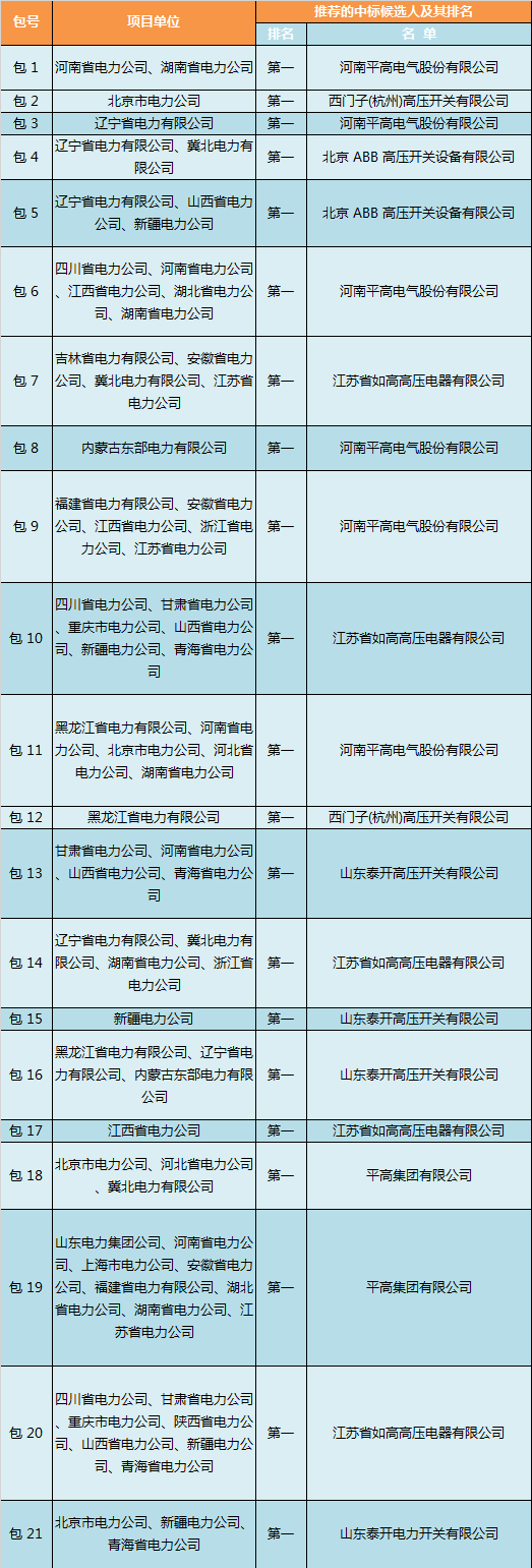 2017年國網第六次變電設備—斷路器中標侯選人名單