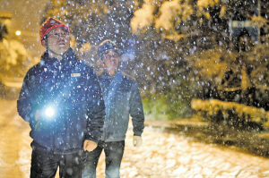 1月4日,安徽六安供電公司配網搶修巡視人員連夜冒雪查找故障點。翁懷龍 攝