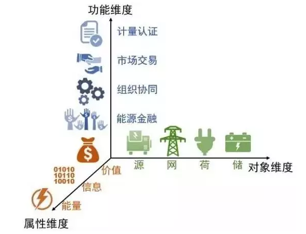 區(qū)塊鏈技術(shù)核心功能就是不依靠中心或者第三方機構(gòu),保障數(shù)據(jù)的真實可信,打破信任壁壘,極大降低了業(yè)務(wù)開展需要支付的信任成本,促進業(yè)務(wù)的高效開展。區(qū)塊鏈的技術(shù)特征與能源互聯(lián)網(wǎng)的理念吻合,使區(qū)塊鏈未來有潛力成為能源互聯(lián)網(wǎng)中重要的技術(shù)解決方案之一。如圖1所示,區(qū)塊鏈技術(shù)在能源互聯(lián)網(wǎng)中的應(yīng)用可以從功能維度、對象維度和屬性維度等三個方面進行歸納和分析。